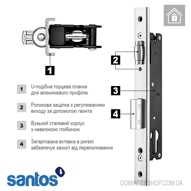 Модель относится к 720-й серии легких замков Сантос, имеющей одинаковые по конструкции модели, но с разным бексетом, глубиной корпуса и шириной планки (22 мм и 24 мм). Предлагаемый замок имеет бексет 20 мм и торцевую планку 240х22 мм. Модель оснащена роликовой защелкой, величина выхода которой регулируется винтом.
