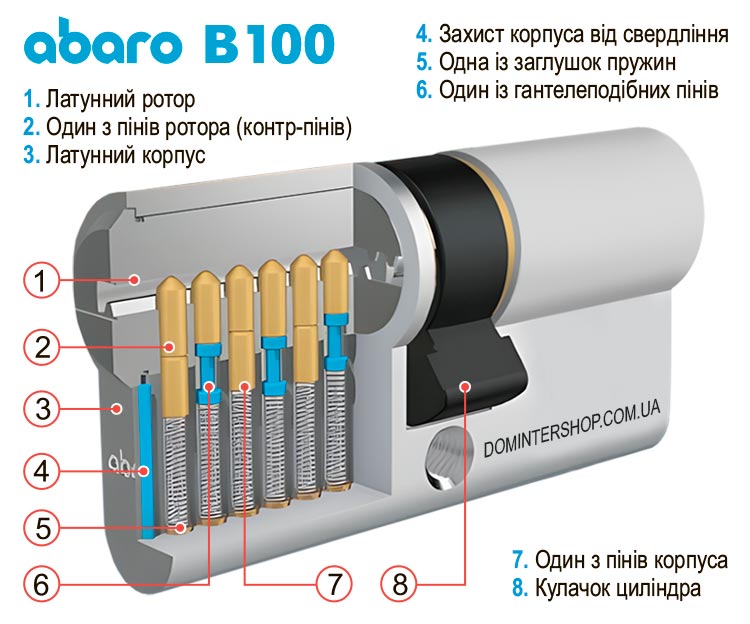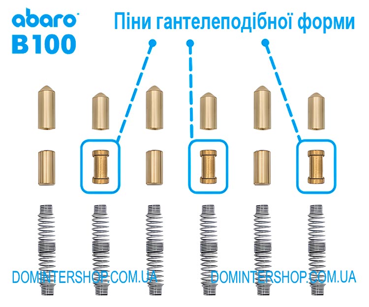 Ключі B100 відлиті з латуні та вкриті нікелем, вони реверсивні — вставляти в серцевину ключ можна будь-яким боком. Головки можна помічати кольоровими маркерами. Тіло ключа цільне, метал знаходиться під пластиком головки — вона ніколи не відламається. Відстань від головки ключа до торця корпусу при вставленому ключі дорівнює 13 міліметрам — це дуже велика відстань, що дозволяє використовувати найтовстіші броненакладки.
