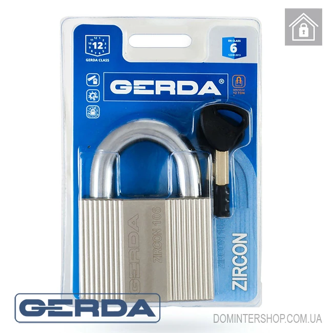 Навісний замок Gerda Zircon 106 виготовляється у Польщі. Не можна не зазначити, що компанія відома насамперед своїми замками — незалежно від класу своєї продукції Gerda забезпечує відмінну якість виготовлення, завдяки якій замки працюють десятиріччями.