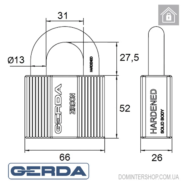 Замок належить до серії Gerda Zircon і може експлуатуватися в будь-яких місцях, де його використання є доцільним, і коли потрібен максимальний рівень безпеки. Модель оснащена монолітним корпусом звичайного типу із загартованої сталі, загартованою скобою та циліндровим механізмом з фінською (дисковою) системою секрету. Фінська система дуже стійка до пилу та бруду, і має відмінну надійність — пропонована модель забезпечує щонайменше 10000 циклів замикання і відмикання. Замок можна замкнути без використання ключа, дужка не відокремлюється від корпусу.